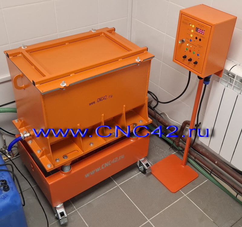 Универсальный станок для виброгалтовки с объемом бака до 65 литров и рабочим объемом до 45 литров. Станок предназначен для осуществления процессов галтовки (шлифование, полировка, очистка) вибрационным способом в сухой и мокрой среде. Процесс обработки может осуществляться всеми видами наполнителя для галтовки. Станок позволяет осуществлять регулировку частоты колебания лотка, что позволяет настраивать нужный режим обработки. Станок имеет настраиваемую функцию реверсивной обработки РРО.